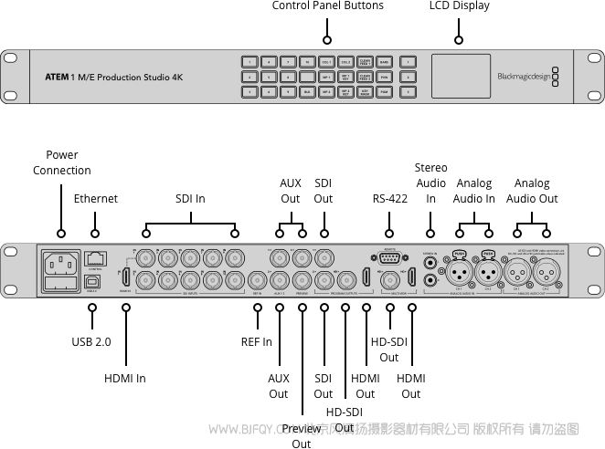 内置LCD监视器,可显示视频,42个LED按钮用于Aux切换。