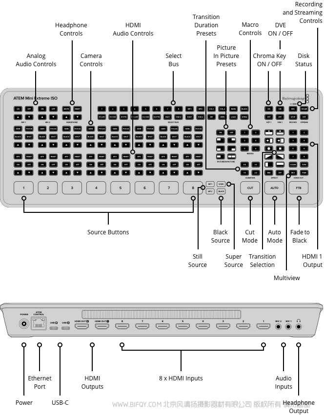 BMD ATEM Mini Extreme ISO 切换台 9个单独的H.264视频流,可采集8路纯净输入信号以及节目视频