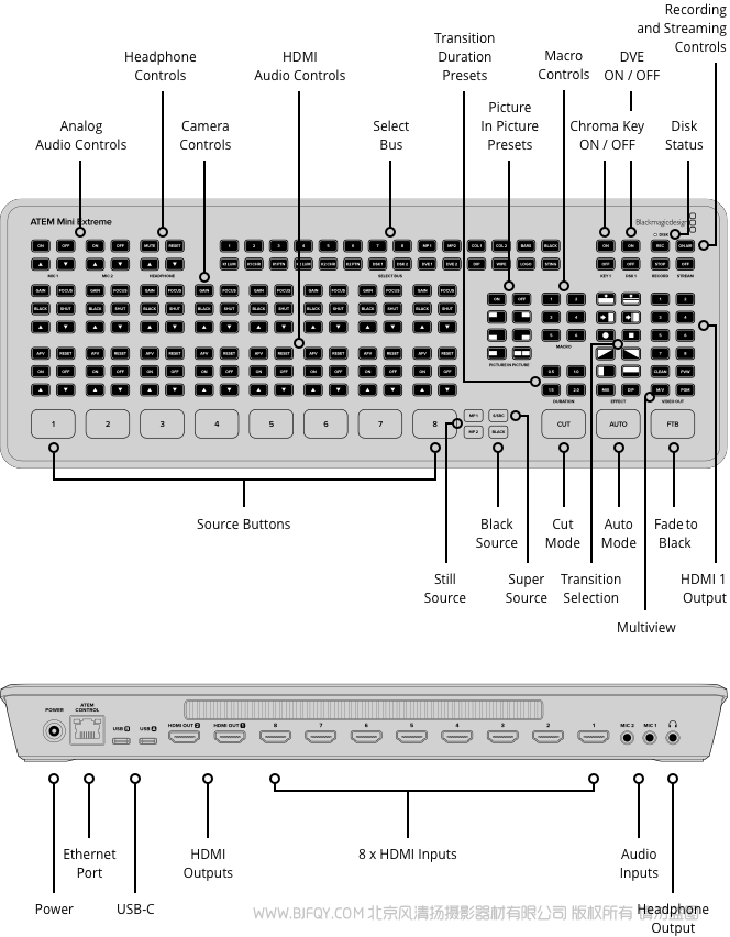 BMD ATEM Mini Extreme 专业级切换台!它拥有ATEM Mini Pro的所有功能,还具备8路HDMI输入、2路单独的HDMI输出、两个USB端口以及一个耳麦接口