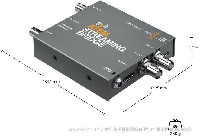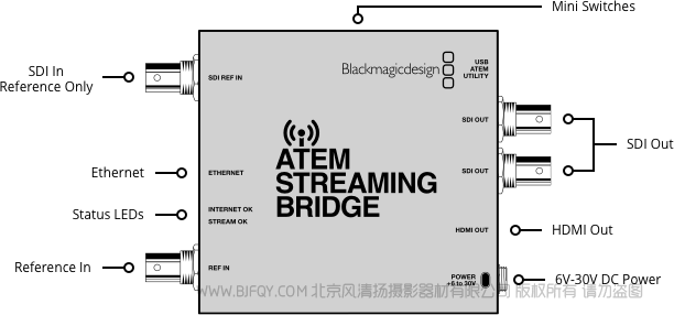 BMD ATEM Streaming Bridge 视频转换器,它可以从任何ATEM Mini Pro上接收H.264视频流并转换回SDI和HDMI视频,以便您将视频发送至本地以太网络的其他地点,或通过互联网发送至全世界