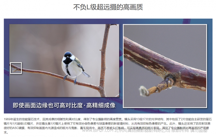 镜头中采用了2片萤石与1片超级UD(超级超低色散)镜片,呈现出了具有高清晰度与高对比度的出色画质。