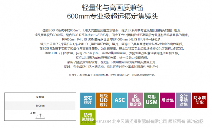 佳能EOS R系统中的600mm、L级大光圈超远摄定焦镜头,继承EF系列新专业级超远摄镜头的设计理念,