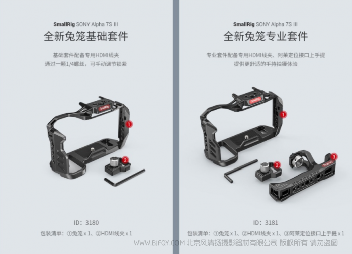 SmallRig SONY A7SIII专用兔笼 套件3181包含一个全包围兔笼,一个HDMI线夹,一个阿莱定位接口上手提。兔笼通过底部一颗1/4”-20螺丝和侧边一颗M2.5螺丝双重锁紧,稳固安全。兔笼上除了有多个1/4”-20和3/8”-16螺丝孔外,还有冷靴槽、滑条以及肩带孔等接口。阿莱定位接口上手提安装在兔笼顶部的3/8“-16阿莱定位孔上,该手柄可以给用户提供舒适的手持拍摄体验。HDMI线夹通过一颗1/4”-20螺丝安装在兔笼左侧,用户可以根据HDMI线的不同型号来调节HDMI线夹的位置以及锁紧块的位置。