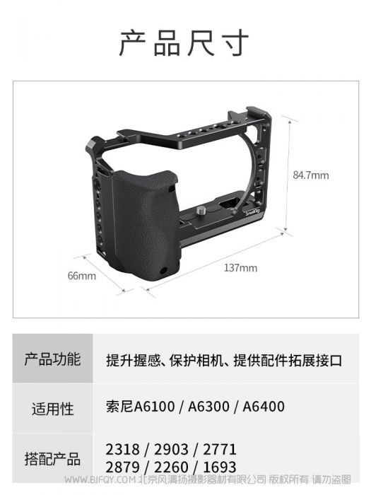 SmallRig Sony A6100/A6300/A6400 Cage 3164是为相机提供保护及配件拓展接口而设计。增加可拆卸硅胶手柄,防滑防冻,提供舒适的手持握感。cage通过底部1颗1/4“-20螺丝锁紧,并利用右侧肩带孔使用M2.5螺丝进行二次锁紧防止偏转,留有多个1/4 "-20、3/8"-16阿莱定位孔用于转接监视器支架2903或mini上手提2771等附件实现完整的拍摄解决方案。顶部两侧各内置1个冷靴,可直接安装麦克风、灯等设备;底部内置一体式阿卡板可快速切换三脚架,设有硅胶垫片避免相机刮花。cage不干涉相机各按键、接口以及红外接收器。可搭配线夹1693保护HDMI线接口。前端自带的M4螺纹孔,可转接Metabones转接环支架1787保护镜头卡口。此外,cage底部内置一字、内六角扳手方便快速拆装。
