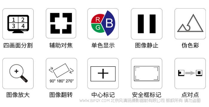 它有着金属机身设计,内置控制面板,并配备四画面分割、辅助对焦、单色显示、图像静止、图像放大、图像翻转、中心标记、安全框标记、点对点、色温等精彩功能,让您轻松检查所有机位是否准确对焦并确保颜色一致。