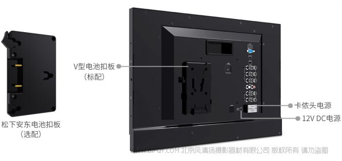 P215-9DSW监视器具有双供电系统:适配器供电或者锂电池供电。采用适配器供电,可通过12V DC电源或者卡侬头电源接口进行供电;锂电池供电可通过索尼V型电池扣板(标配),松下安东电池扣板(选配)进行供电。因此可为您提供极大的灵活性,无论是外景还是演播室制作都能使用。