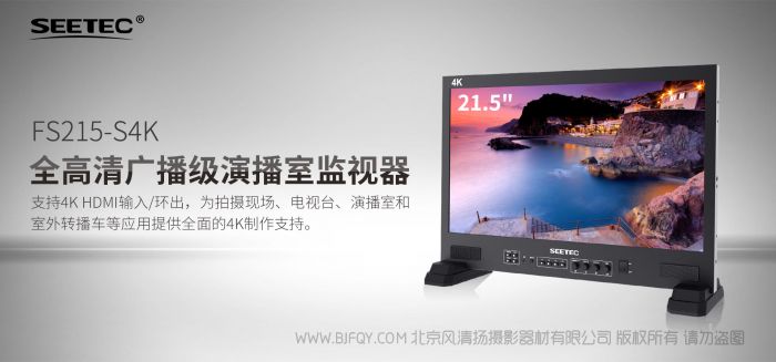 SEETEC FS215-S4K一款应用广泛的高品质监视器,从广电机构到移动式现场制作,甚至是电影外景拍摄制作都能胜任!配备了3G-SDI、HDM、Video、AUDIO、RS485和DVI-I,多种输入方式满足您各种专业显示方案的需求。