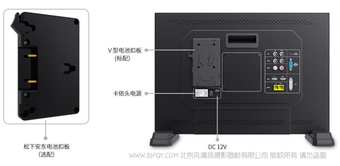 SEETEC FS215-S4K监视器具有双供电系统:适配器供电或者锂电池供电。采用适配器供电,可通过12V DC电源或者卡侬头电源接口进行供电; 锂电池供电可通过索尼V型电池扣板(标配),松下安东电池扣板(选配)进行供电。因此可为您提供极大的灵活性,无论是外景还是演播室制作都能使用。