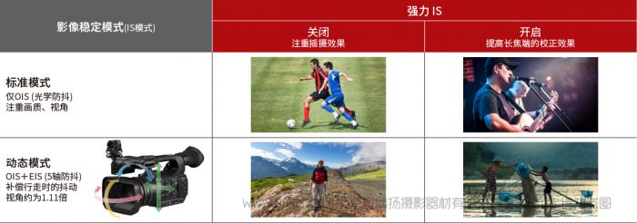 防抖校正功能可通过标准模式、动态模式、强力防抖开启/关闭的不同组合获得4种效果。可根据拍摄场景和拍摄对象进行有效控制,拍摄出更为理想的画面效果。