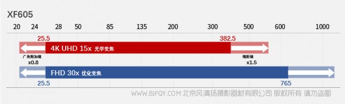 XF605搭载佳能4K视频专用高性能“L”镜头,佳能L镜头以其优秀的成像性能、出色的易操作性、环境可靠性、坚固性,吸引了众多专业用户。XF605这枚“L”镜头为15倍光学变焦镜头,采用双面非球面镜片和具有与萤石同等光学特性的超级UD镜片,在全变焦范围及全画面内实现了高画质。超广角端为25.5mm焦距,有助于狭小空间中的拍摄。与专用广角附加镜及增距镜搭配使用,可适用于更多场景。另外,在全高清分辨率时,可通过4K传感器实现较大约30倍的优化变焦,画质不降低。