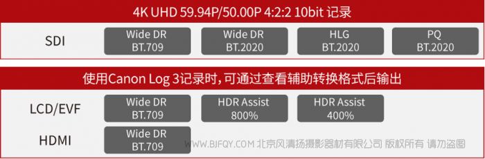 | 伽马预置 | PQ / HLG / Canon Log 3 / Wide DR / BT.709 Normal / BT.709 Standard |