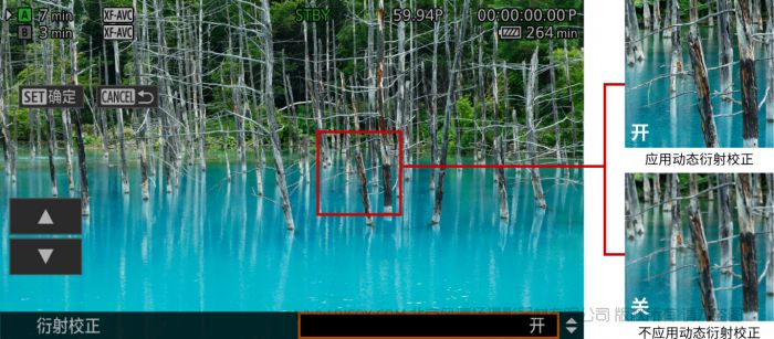 DIGIC DV 7的高速图像处理能力使专业摄像机也可使用CINEMA EOS机型所搭载的衍射校正算法。该功能可以校正泛焦拍摄时小光圈衍射所导致的画面模糊,从而让用户可使用比以往更小的光圈进行拍摄。