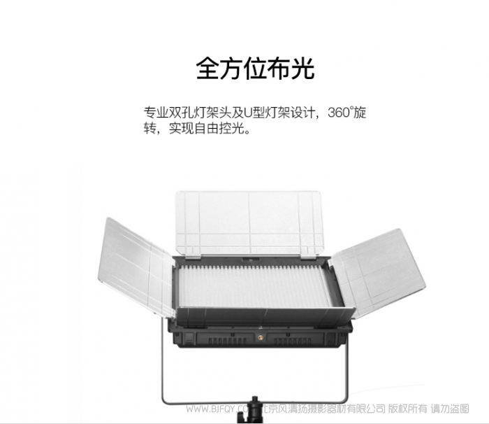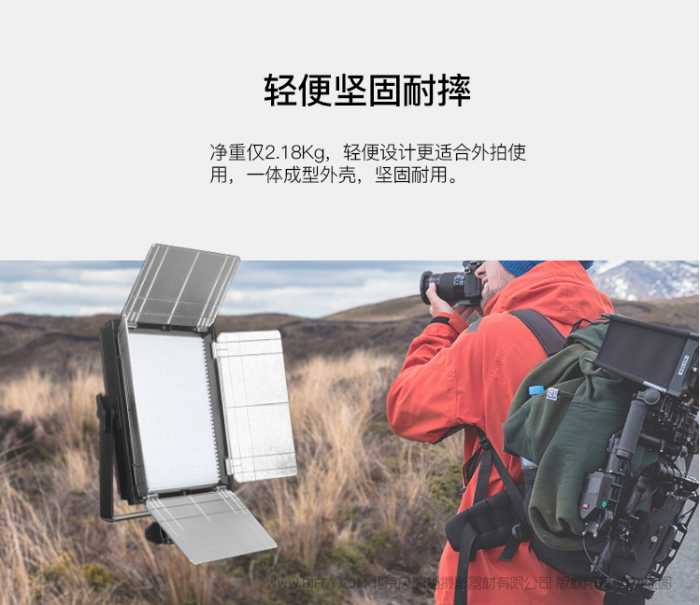 亮度高,单灯1米的距离亮度高达12400LUX,显色性高达98,精准还原色彩,配有拉杆箱,轻便,单灯仅重2.18KG,便携带,可以用于影视制作,视频拍摄,广告制作,直播补光,户外拍摄