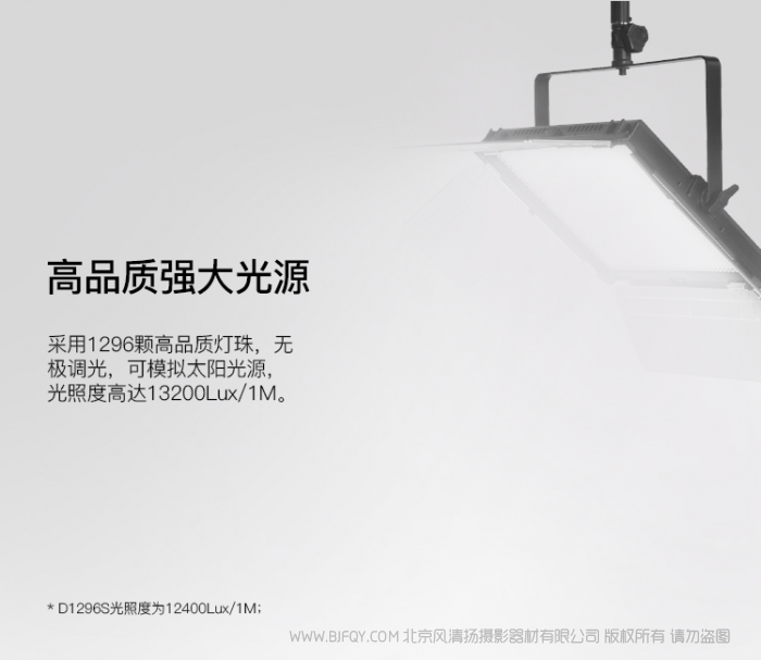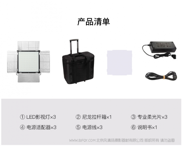 14、产品标配:D1296SPlus灯体×3、15V/8A电源适配器×3、乳白匀光板×3、电源线×3、带轮尼龙拉杆硬箱×1(不含灯架套装)