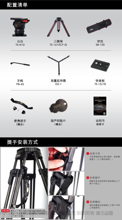 1.云台 TS-N10 2.三脚架 TS-1610CF-Q 3.软包SB-135 4.手柄PB-45 5.地置延伸器GS-1 6快装板TS-15/18 7.便携提手(赠品) 8.葫芦钥匙片 (赠品) 9.说明书/保修卡 |