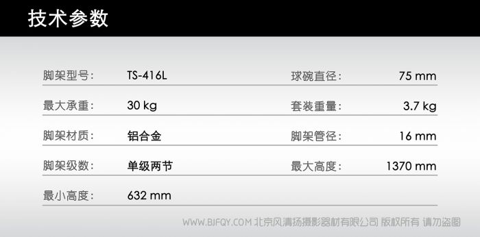 | 脚架型号 | TS-416L | 球碗直径 | 75mm |
