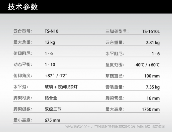 图瑞斯 TERIS TS-N10L 铝合金套装 较大承重 : 12kg俯仰阻尼 : 1-6水平阻尼 : 1-6