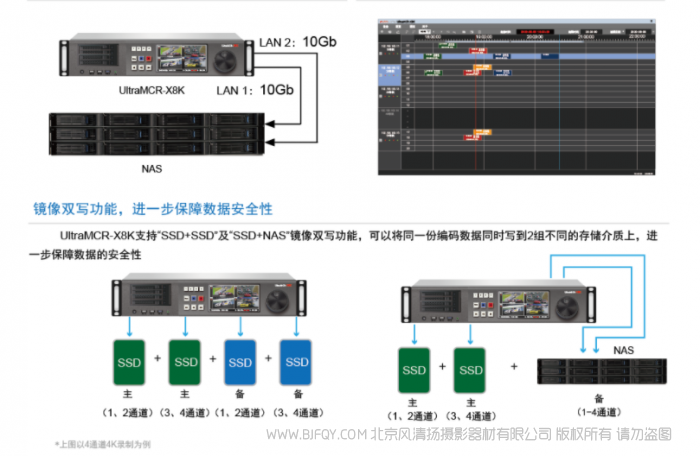 广播级8K/多通道4K录像机,在2RU机架空间内,可高质量录制1路8K或4路4K节目、支持HDR、WCG、Data Range等元数据的记录,还支持SSD+万兆NAS 双写录制,可全面满足8K及多通道4K节目的记录需求