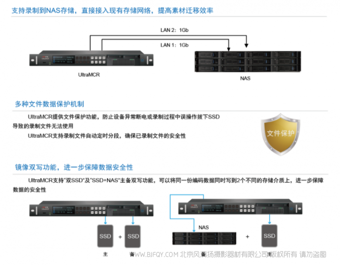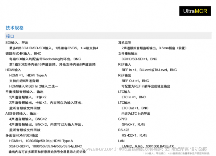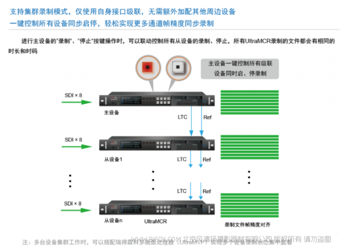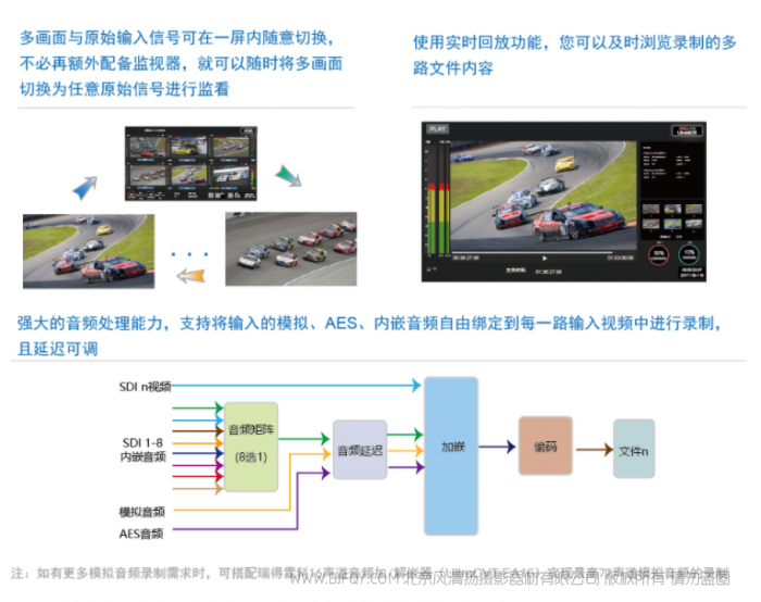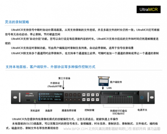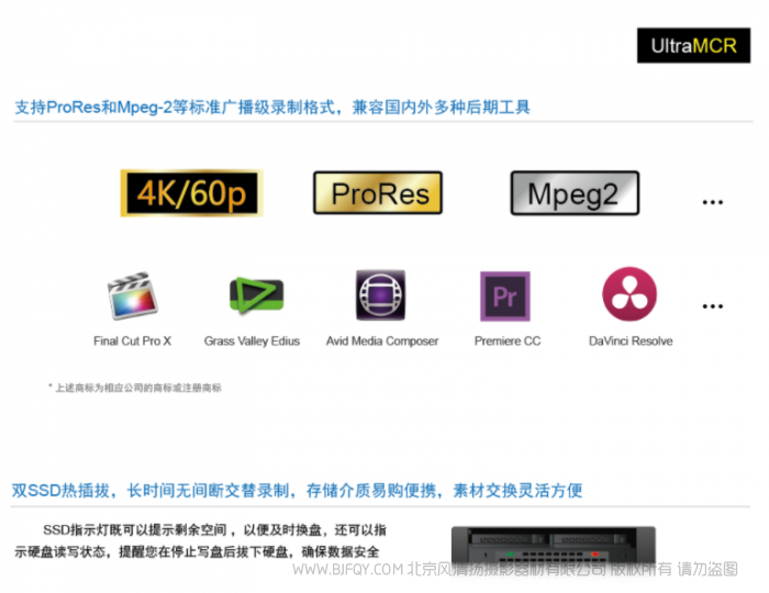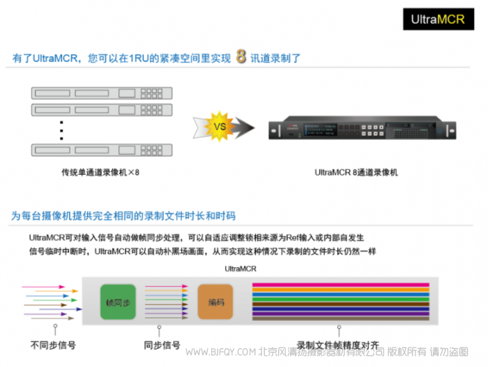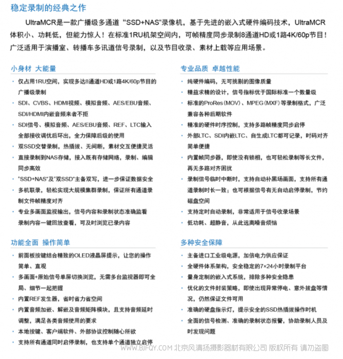 一款广播级多通道SSD+NAS录像机,基于先进的嵌入式硬件编码技术,UltraMCR体积小、功耗低,但能力惊人,在标准1RU机架空间内,可帧精度同步录制8通道HD或1路4K/60p节目,广泛适用于演播室、转播车多迅道信号录制,以及节目收录、素材上载等应用场景