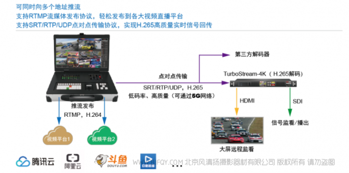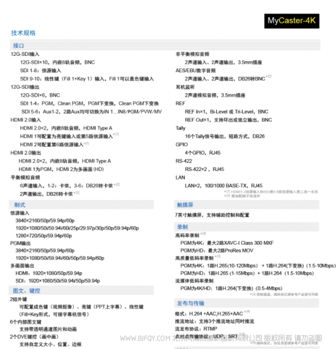 | 发布与传输 | 格式∶H.264+AAC,H265+AAC*【4】推流地址支持3个推流地址同时推流流发布协议RTMP 点对点传输协议UDP,SRT*【4】(【4】编码格式、协议类型请参考产品型号列表) | |
