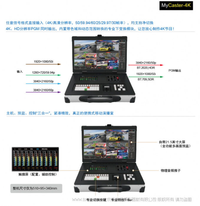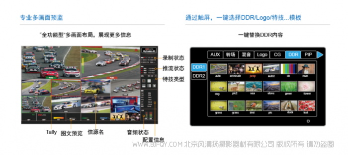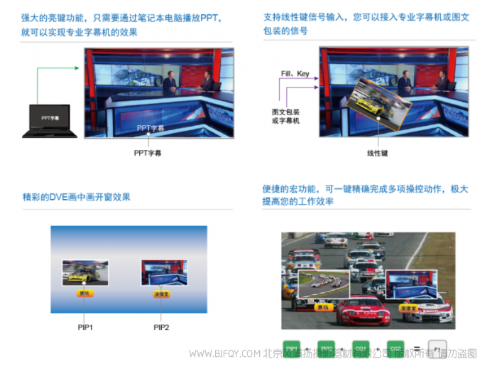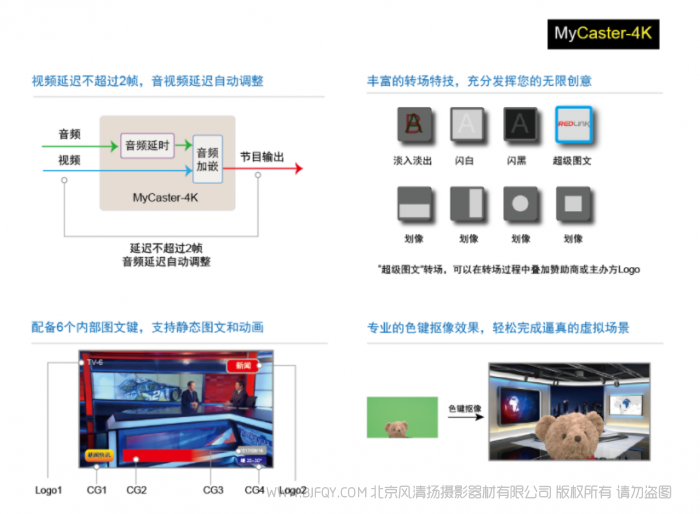 | 图文、键控 | 2组外键∶可配置成亮键(PPT上字幕)、线性键(Fil+Key形式,可接字幕机信号) 6个内部图文键∶支持带透明通道图片和动画 2个DVE键控(画中画)支持自定义大小、位置、边框 | |