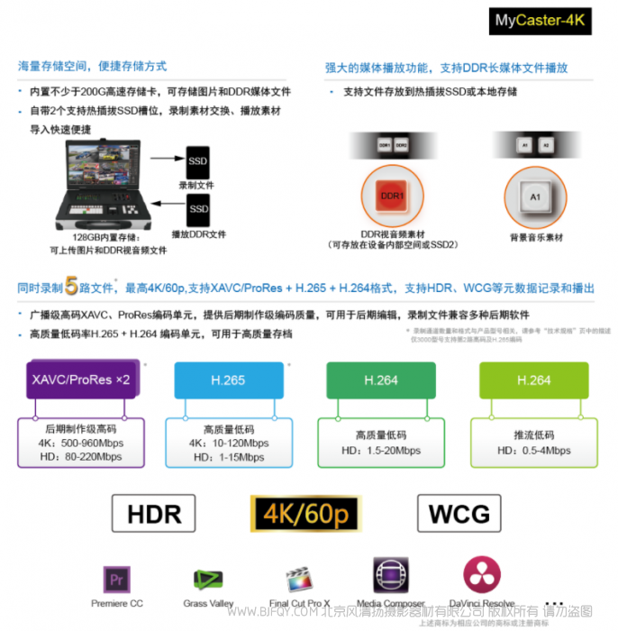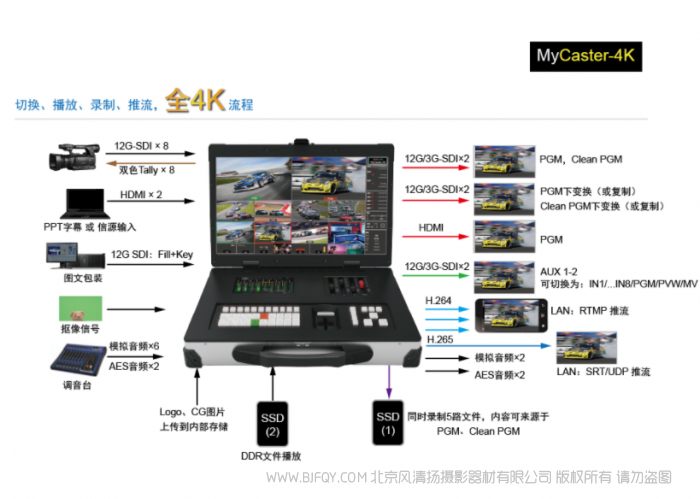 | 流媒体低码率录制 | PGM为4K/HD∶1路H264(下变换)(0.5-4Mbps) | |