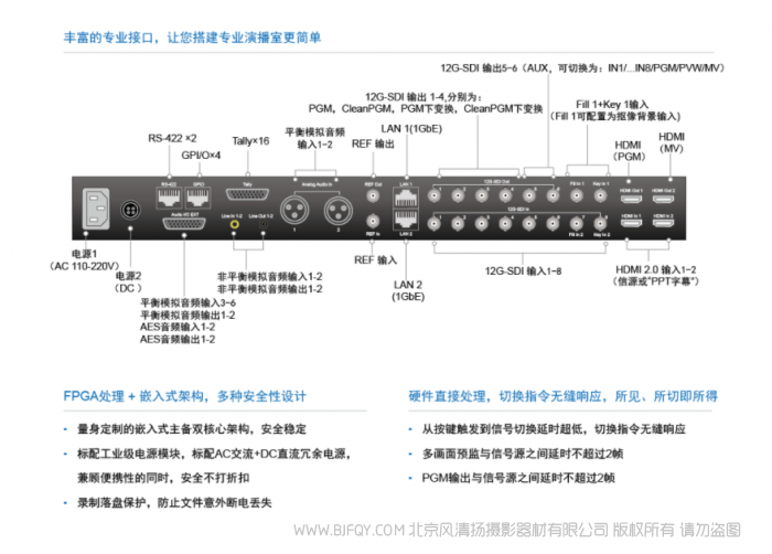 | 12G-SDI 输出 | 12G-SDIX6, BNC SDI 1-4: PGM, Clean PGM, PGM下变换,Clean PGM下变换 SDI 5-6: Aux1-2, 2路Aux均可切换为IN 1 …IN8/PGM/PVW/MV | |
