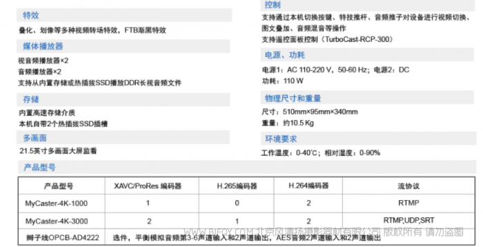 | 控制 | 支持通过本机切换按键、特技推杆、音频推子对设备进行视频切换、图文叠加、音频混音等操作 支持遥控面板控制(TurboCast-RCP-300) | |