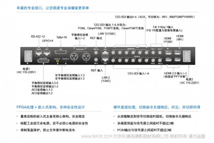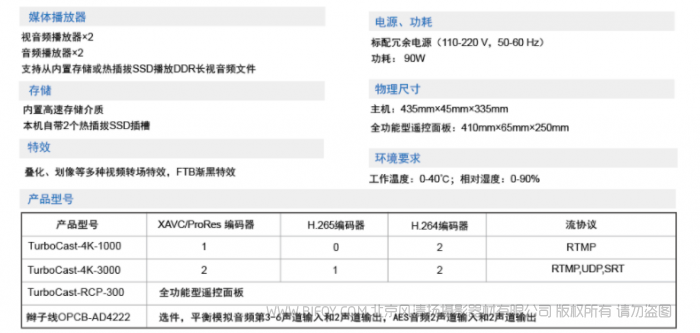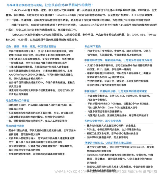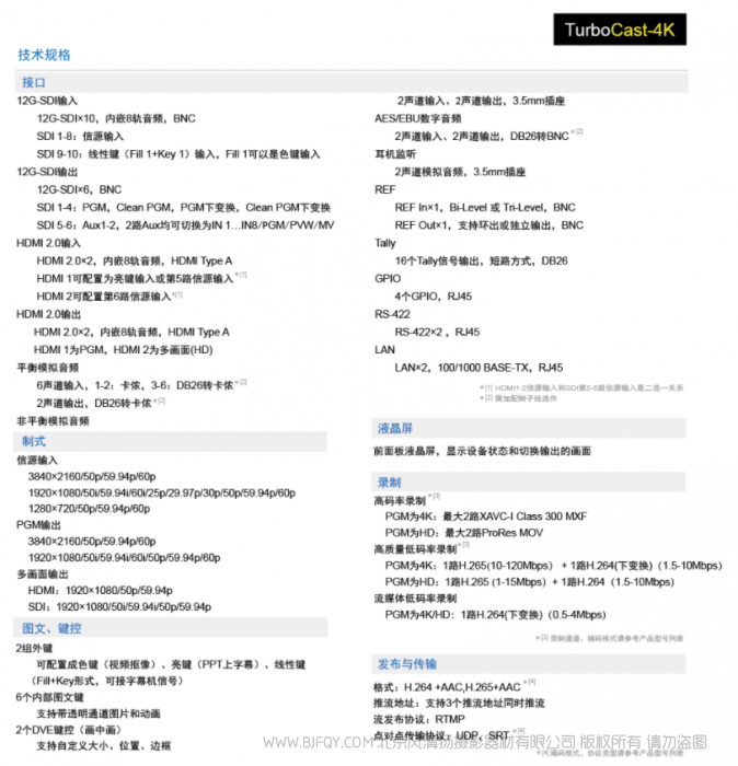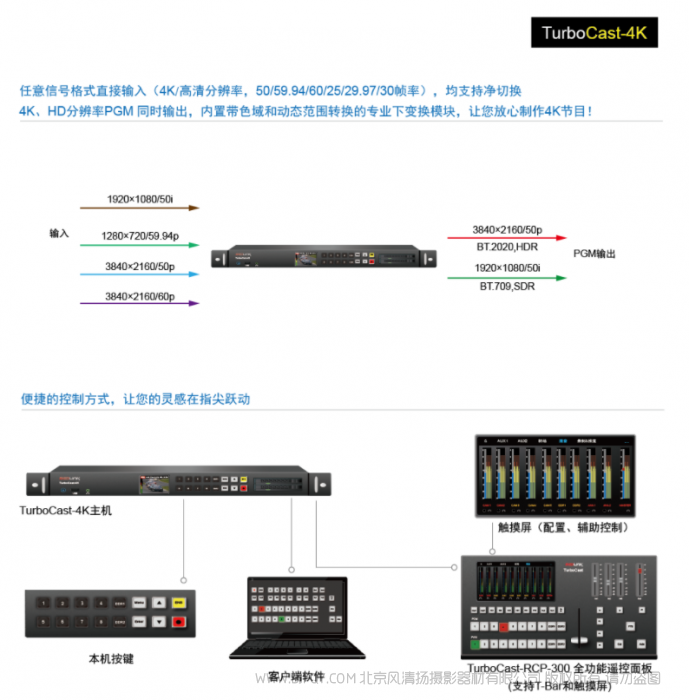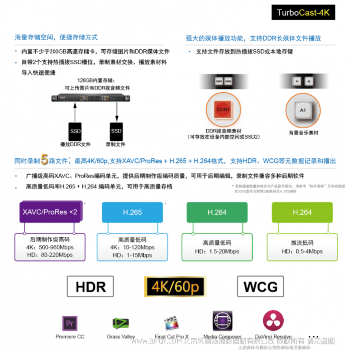 支持色域和HDR动态范围转换,让您放心监看、制作节目,产品自带多种格式编码器 XAVC、ProRes和H265、H264等,以完成现场节目的高质量录制和推流发布