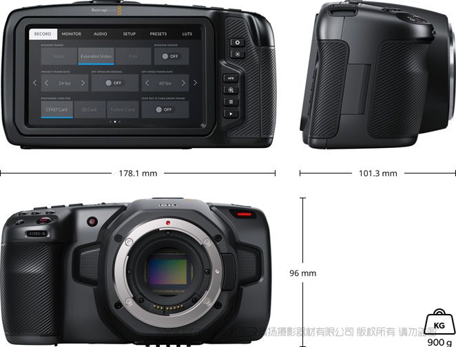 1个CFast卡槽、1个SD UHS-II卡槽、1个USB-C 3.1 Gen 1扩展端口可用于外部存储介质录制Blackmagic RAW和ProRes格式。