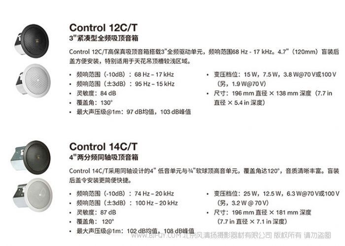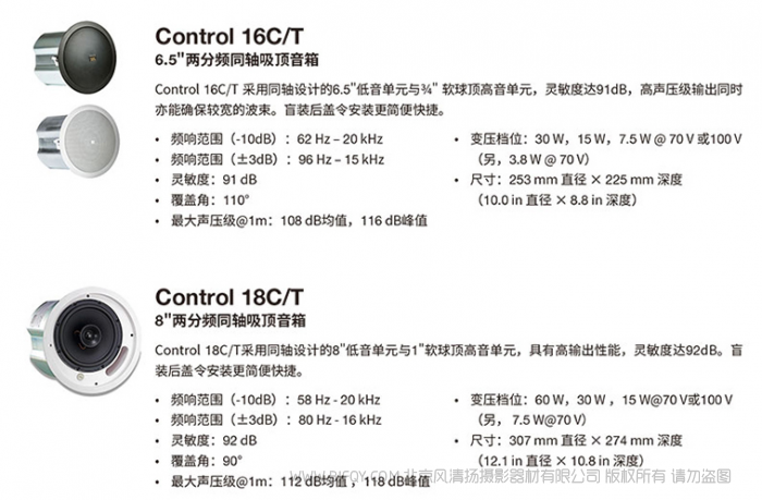 哈曼 JBL Control 12C/T 14C/T 16C/T 18C/T 吸顶音响 会议广播