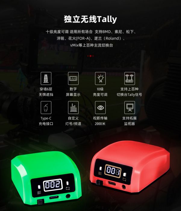 | tally灯 | tally-450 | 4/8/任意 | 1.具有数字屏幕,方便调节频道、亮度、灯号。 2.十级亮度可调,可依据现场光线随时调整亮度,全方向可见。 3.工作时间达10-30小时。一次充电可满足多次使用。 4.红绿双色大面积LED灯阵列。 5.具有¼接口,支持热靴、绑带多种固定方式 6.支持所有主流品牌切换台 |