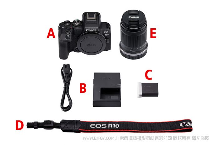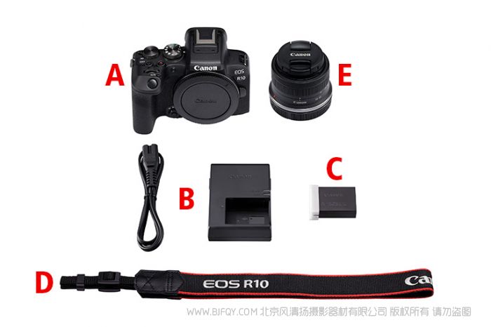 ![]() | EOS R10套机附件图(RF-S18-45mm F4.5-6.3 IS STM)A. EOS R10机身 B.电池充电器LC-E17C(含电源线) C.锂电池LP-E17 D.相机背带 ER-EOSR10 E. RF-S18-45mm F4.5-6.3 IS STM | 6399元 |