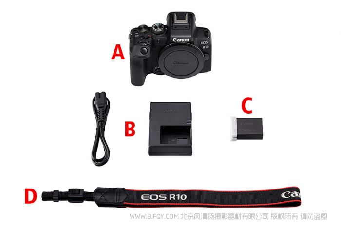 ![]() | EOS R10机身附件图A. EOS R10机身 B.电池充电器LC-E17C(含电源线) C.锂电池LP-E17 D.相机背带 ER-EOSR10 | 5399元 |