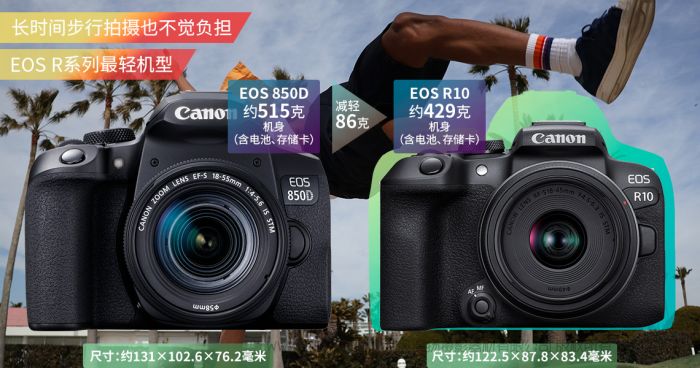 EOS 850D安装套机镜头EF-S 18-55mm f/4-5.6 IS STM时,重量约664克。EOS R10搭配套机镜头RF-S18-45mm F4.5-6.3 IS STM时仅重约559克。轻了约105克(含电池及存储卡)。