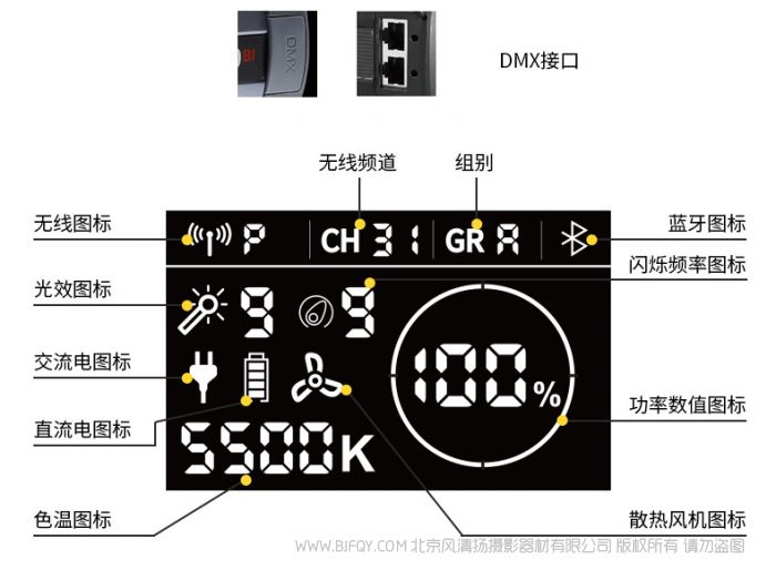 支持灯体操控、2.4GHz无线遥控器遥控、蓝牙5.0手机APP遥控,灯体外置DMX拓展口可实现更多只能操控。