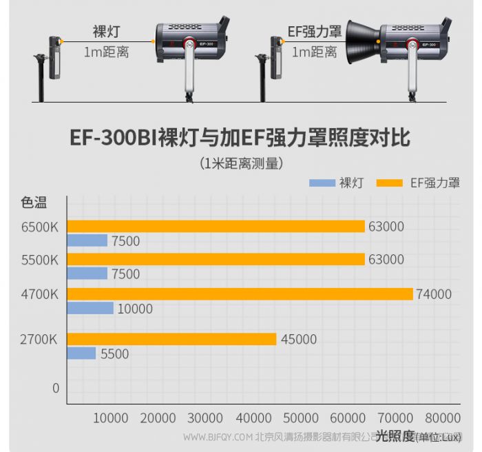 | 100%照度Lux 距离1m | 2700K裸灯>5500Lux/EF强力反光罩 >45000Lux 4200K裸灯>10000Lux/EF强力反光罩 >74000Lux 5500K裸灯>7500Lux/EF强力反光罩 >63000Lux 6500K裸灯>7500Lux/EF强力反光罩 >63000Lux |