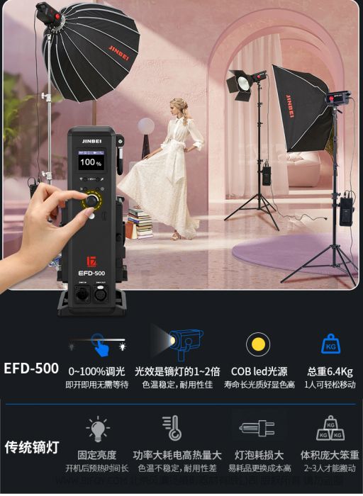 可应用种类齐全丰富的金贝专业附件系统,营造丰富的光影效果;满足专业的视频、直播、摄影布光不同需求