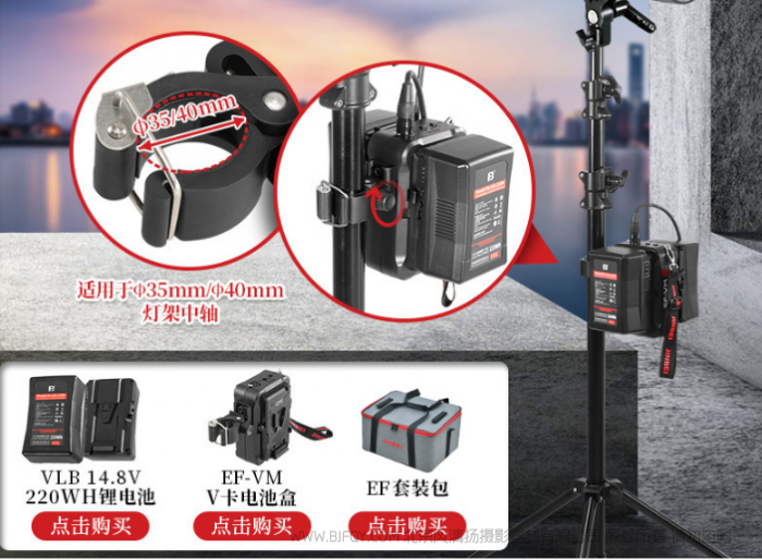 | 电池输入 | 选配EF-VM电动盒安装2节VLB14.8V 220WH 锂电池 全光>80分钟 |