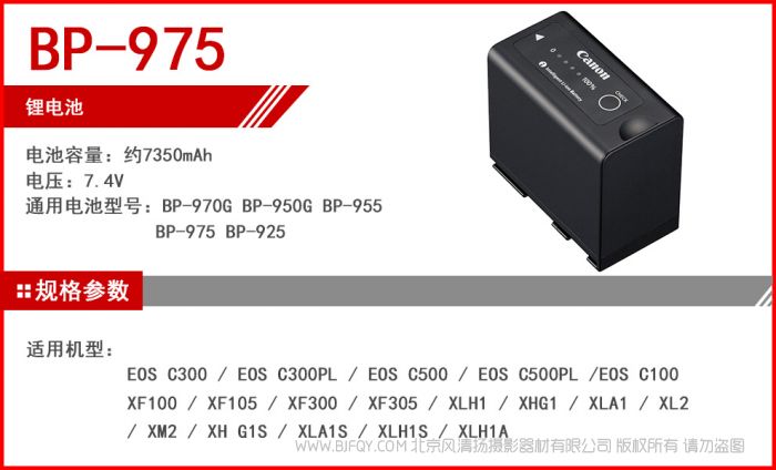 佳能原厂可充电锂电池:BP-975(电池容量7350毫安)