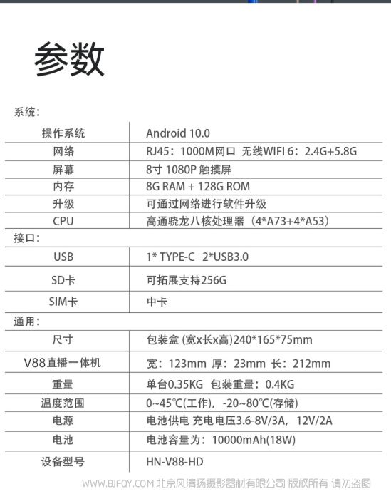 | V88 直播一体机 | 宽:123mm 厚: 23mm 长:212mm |