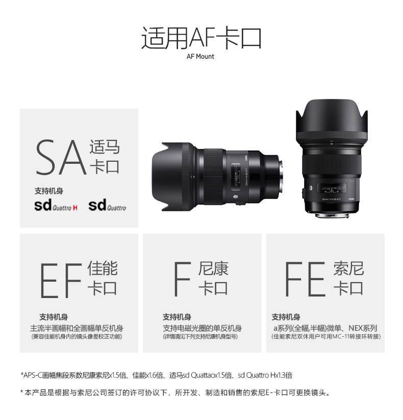 适马SA / 尼康F /佳能EF / 索尼α / 索尼E / L