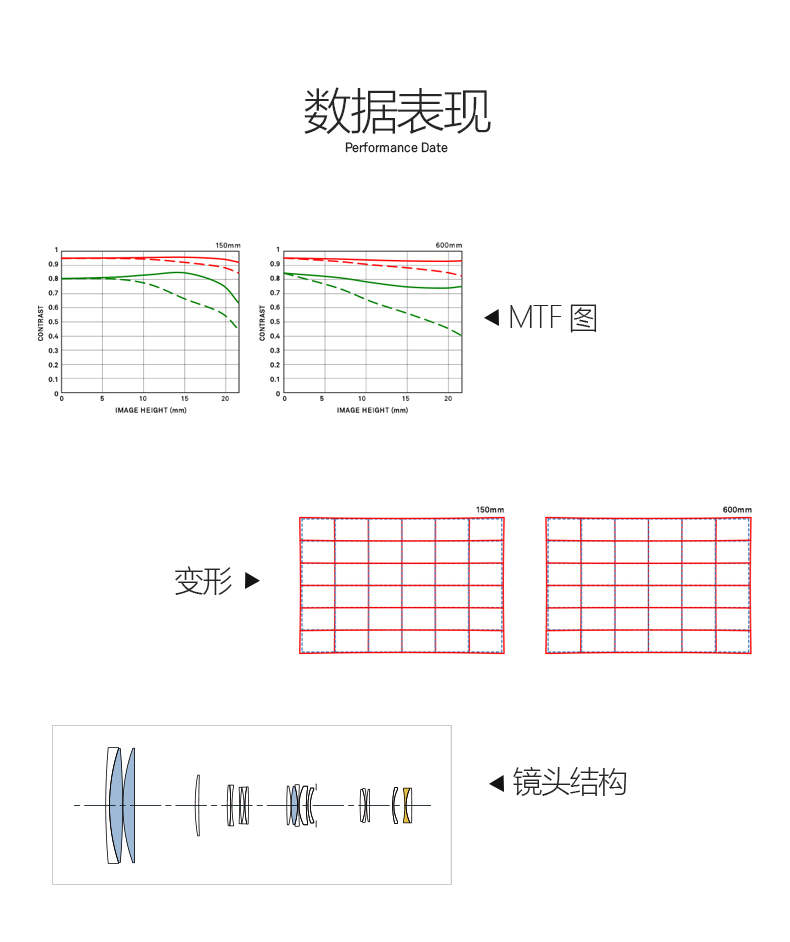 在光学性能上尽可能地接近150-600mm F5-6.3 DG OS HSM | Sports,设想到随身携带以及长时间手持拍摄等需求所开发设计的小型轻量版。对于光学性能也极其重视,采用了1枚萤石级FLD镜片,3枚SLD特殊低色散镜片,通过镜头结构的有效配置,不仅仅是超长焦镜头受期待的望远端,同时对全焦段的各种色像差都进行了有效修正。作为多用于“实战”拍摄情况下的超长焦变焦镜头,采用了简易的防尘防滴设计,以及可以拆卸的脚架等,实用性无与伦比。