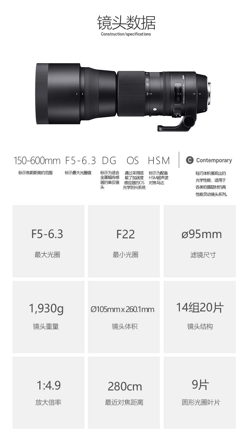 Sigma适马150-600mm F5-6.3 DG OS HSM Contemporary 专业远摄打鸟变焦镜头 全金属