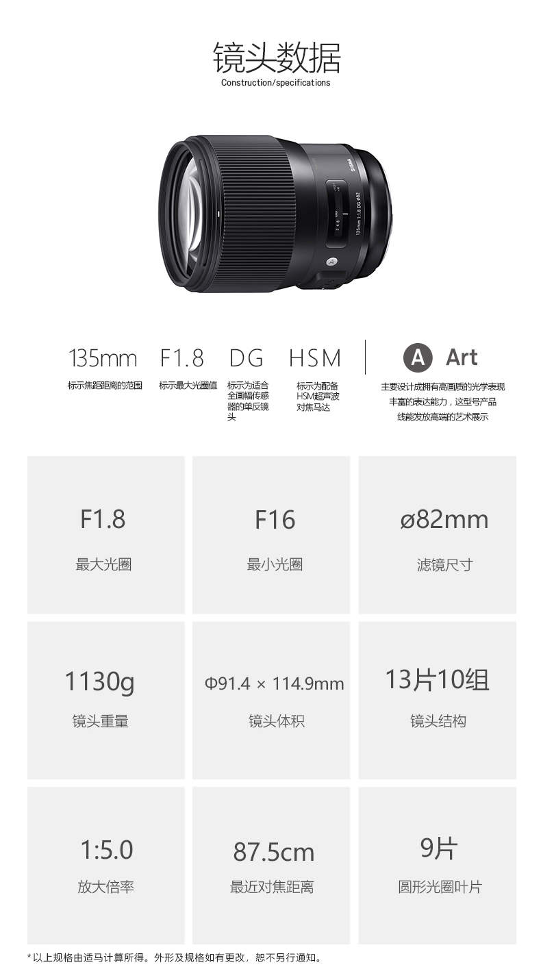 适马/sigma Art 135mm F1.8 DG HSM 全画幅大光圈人像定焦镜头