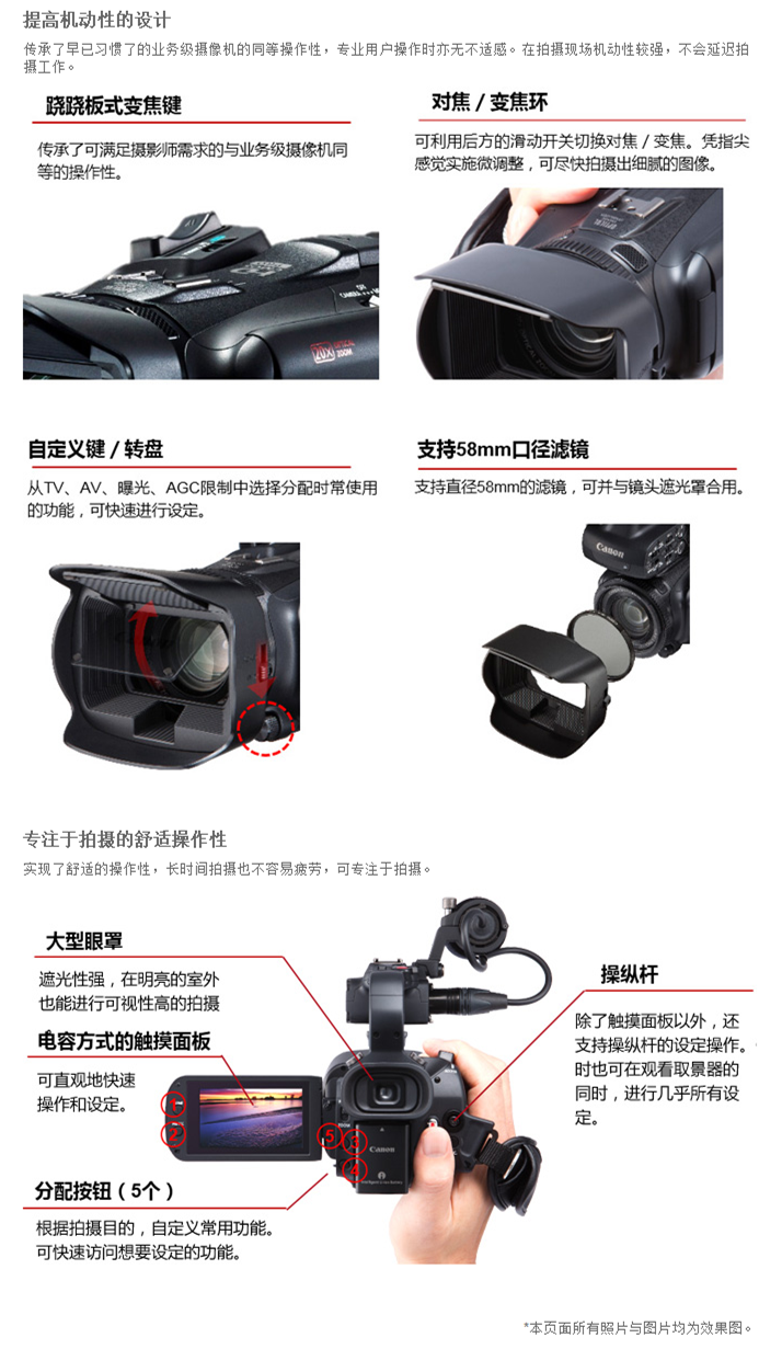 | 机身重量 | 约750克(机身) 约1140克 (含镜头罩,麦克风支架,BP-820电池和1张存储卡) | 约745克(机身) 约1135克(含镜头罩,麦克风支架,BP-820电池和1张存储卡) | |||