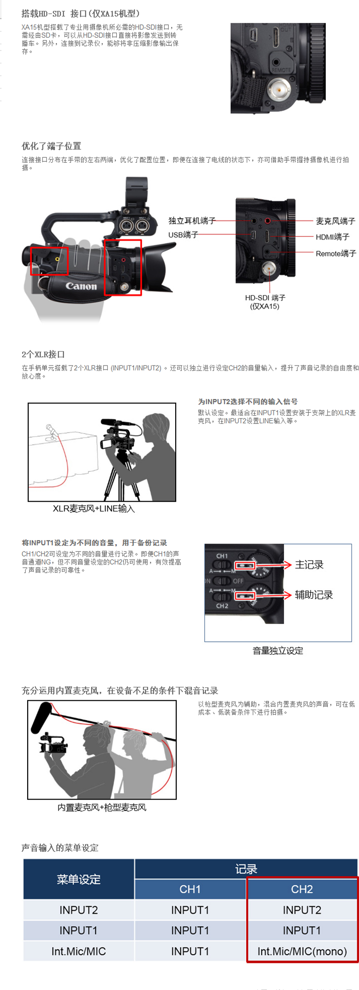 | 输入输出 接口 | 视频接口 | HD/SD-SDI(限XA15,仅输出),HDMI迷你接口(仅限输出),AV端子(仅限输出) | |||