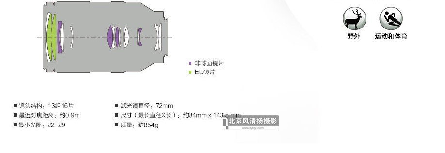 - 4枚非球面玻璃镜片、2枚ED(超低色散)玻璃镜片和纳米抗反射涂层,有效地抑制球面像差、畸变和色差。