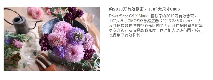 PowerShot G9 X Mark II搭载了1.0"大尺寸CMOS图像感应器(约13.2×8.8 mm),有效像素约2010万,结合性能更加强劲的DIGIC 7影像处理器和F2.0大光圈(较大广角端)镜头,照片和短片的拍摄性能都很出色。3.0"触摸屏和控制环的设计,使操控性更进一步。相机外形复古典雅,机身纤薄,适合随身携带,方便日常生活中随拍。