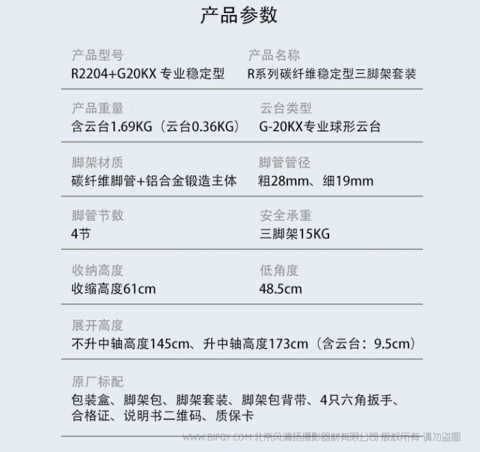 | 原厂标配 | 包装盒、脚架包、脚架套装、脚架包背带、4只六角扳手、合格证、说明书二维码、质保卡 |